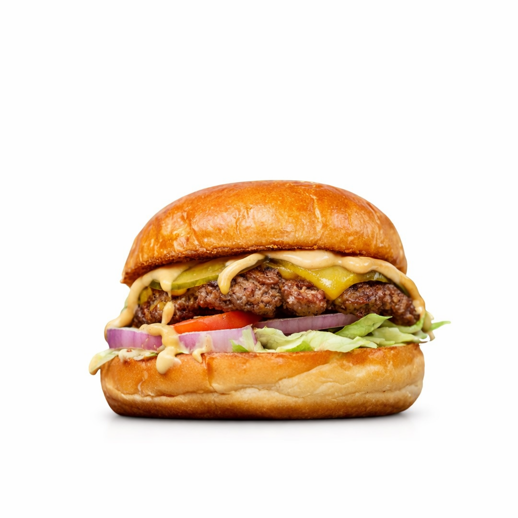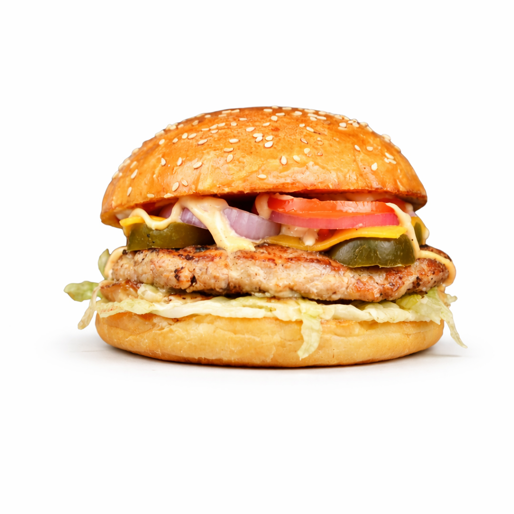 The beef burger features a juicy, perfectly grilled beef patty layered with melted cheese, fresh lettuce, ripe tomatoes, and our special sauce, all served in a soft toasted bun. Packed with flavor and tenderness, it’s a classic burger experience that delivers satisfaction in every bite.